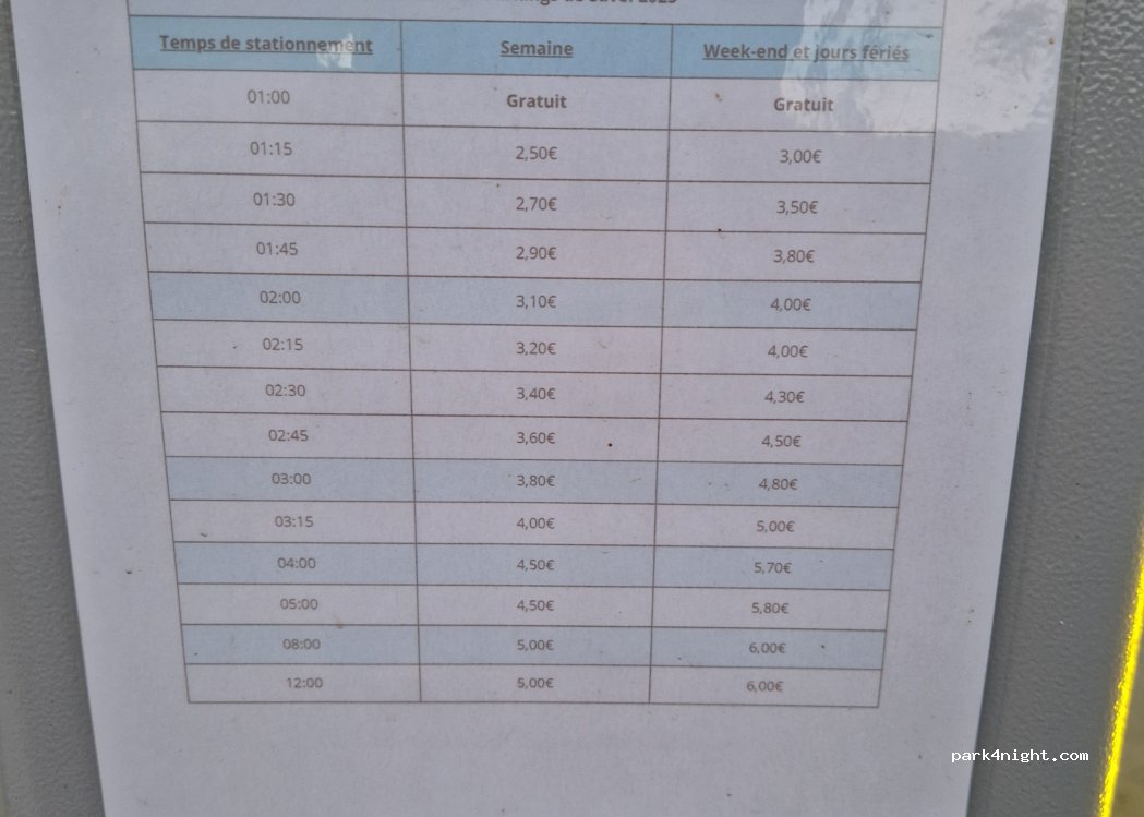 Parking payant et interdit au camping car, du moins en pleine saison. nous nous y sommes quand même garé car nous n'avons pas vu le picto comme quoi ce parking était interdit aux camping car et nous n'avons pas eu d'ennuie. mais mieux vaut éviter pour pas avoir de mauvaises surprises. je met quand même 3 étoiles car il est très bien situé.