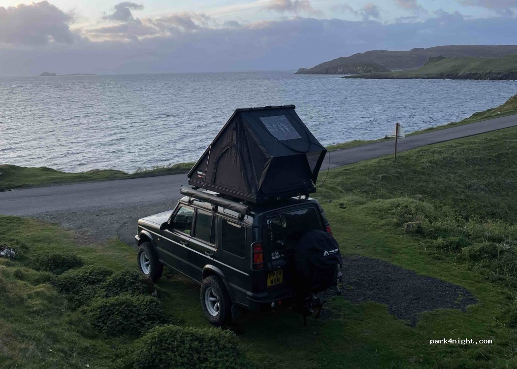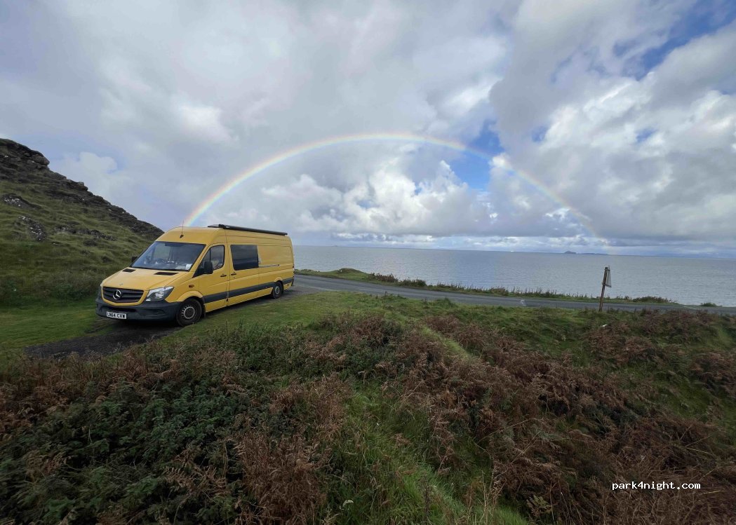 Beautiful and almost level parking space right on the sea and overlooking the sunset. The place is a bit back from the street (single track). The ruin of Castle Duntulm is within sight and distance (about 750m).