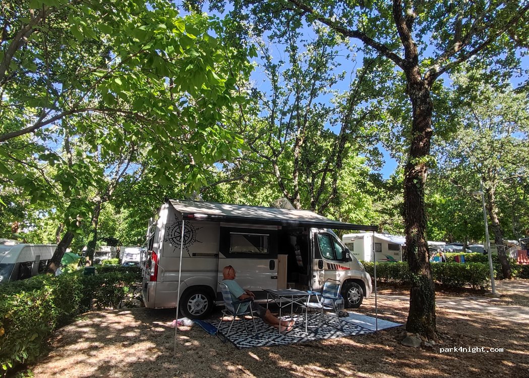 De bomen geven schaduw. Kampwinkel heeft de eerste benodigdheden. Het sanitair is prima, maar te weinig capaciteit. Hierdoor heb je kans op bepaalde momenten in de rij te staan voor toilet of douche. Daarom niet meer dan 3 sterren. Drie nachten , camper, 2 volwassenen en hond circa 182 euro . Prijzig, maar dat zijn alle campings in deze regio. Toeristische en veel drukte ( augustus ) .