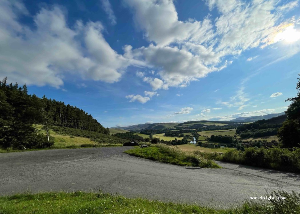 Sitio tranquilo y amplio, parking de grava en el que caben 5-6 campers con espacio entre ellas. Hay una mesita de picnic y algunos bancos. Sitio silencioso por la noche y tranquilo por la mañana. Perfecto para pasar una noche con vistas a peebles. Lo único negativo, en los arboles del fondo habia algo de basura que la gente ha dejado. Por lo demas perfecto.