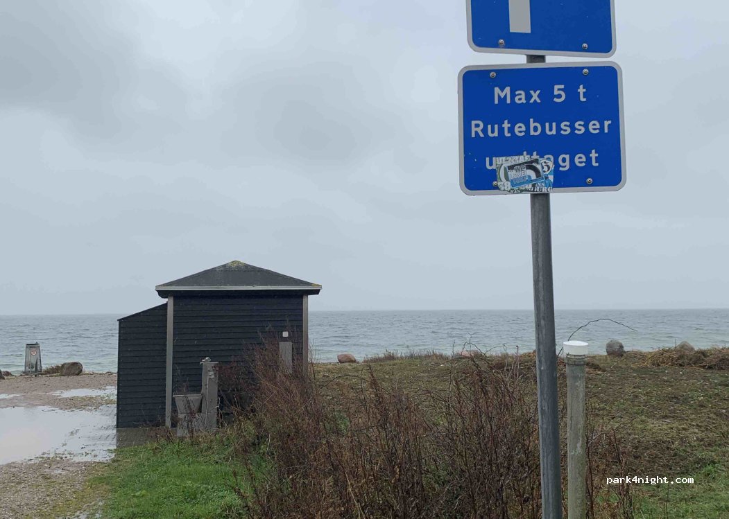 Parcheggio sulla spiaggia, sotto il faro di Kegnæs. Bagni pubblici, tavoli bassi.