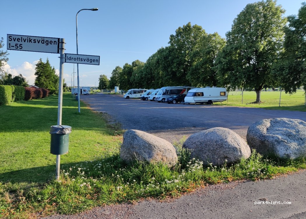 Large graveled parking lot next to a sport field. A bit leveled. Walking distance to towncenter and tourist attractions. Large waste bin onsite. A bit speeding in the evening… but it didn’t last too long. Only motorhome when I visited in late of September. Cellphone service good.