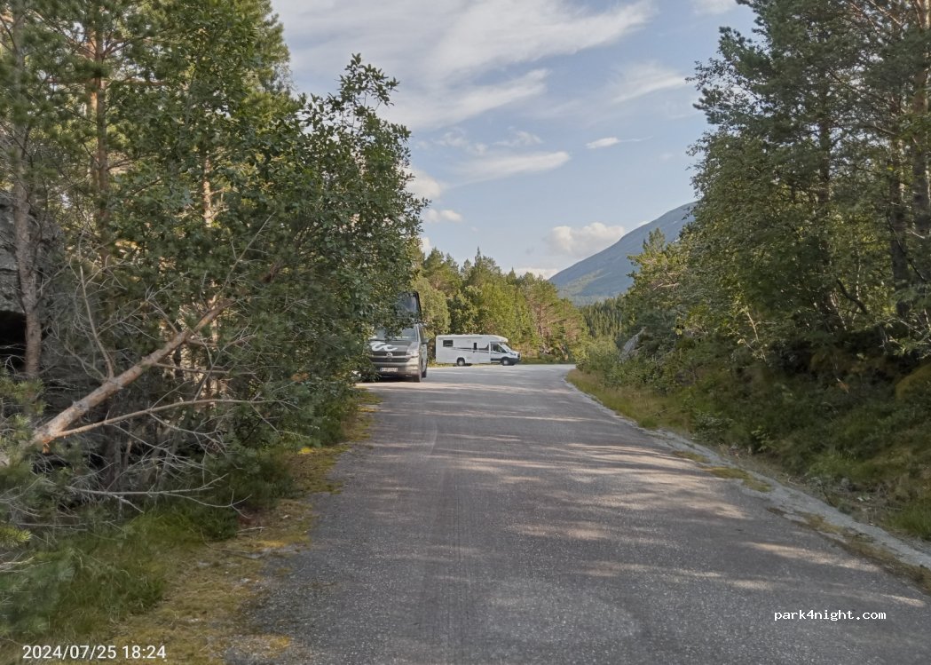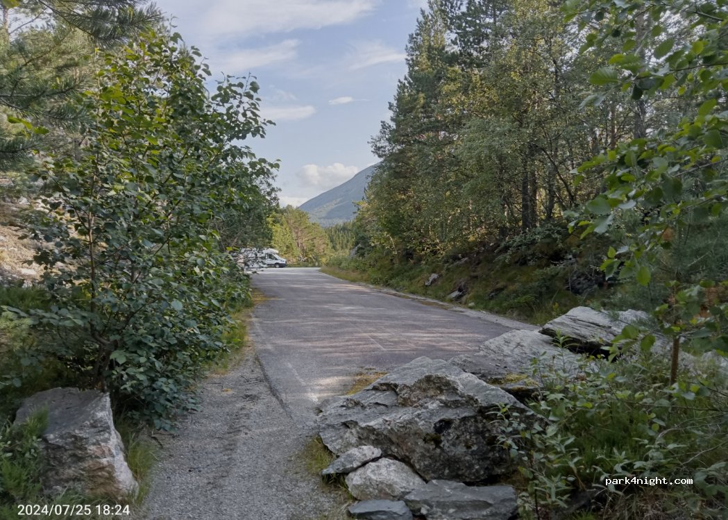 Don’t think the main description for this site is accurate. The entry point is before the tunnel coming from Sunndalsøra. Access is easy. Not the flattest bit of asphalt but plenty big enough. Starting point for a few hikes but v quiet after the day visitors have left. No facilities so come equipped/prepared. Great views after a short walk through the pines