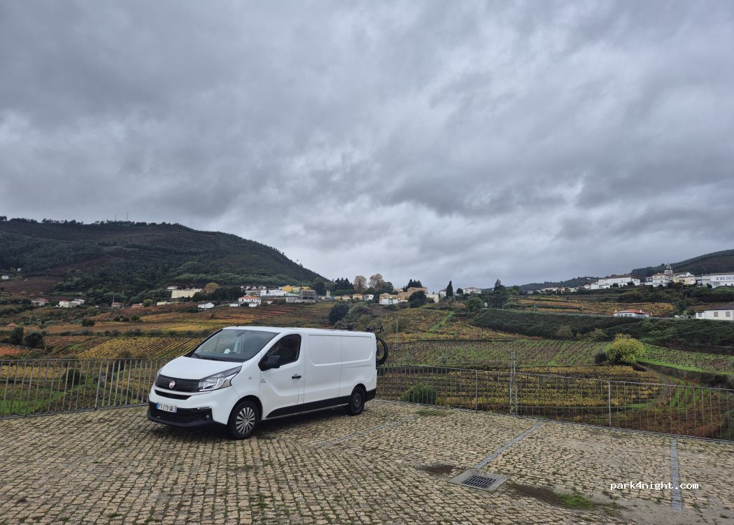 Erweiterter Parkplatz neben dem Friedhof, flach und unten beleuchtet (ca. 100 m von der Straße N101 entfernt). Atemberaubende Aussicht auf das Douro-Tal und die Weinberge. Die kleine Stadt Mesão Frio liegt 1 km oberhalb.