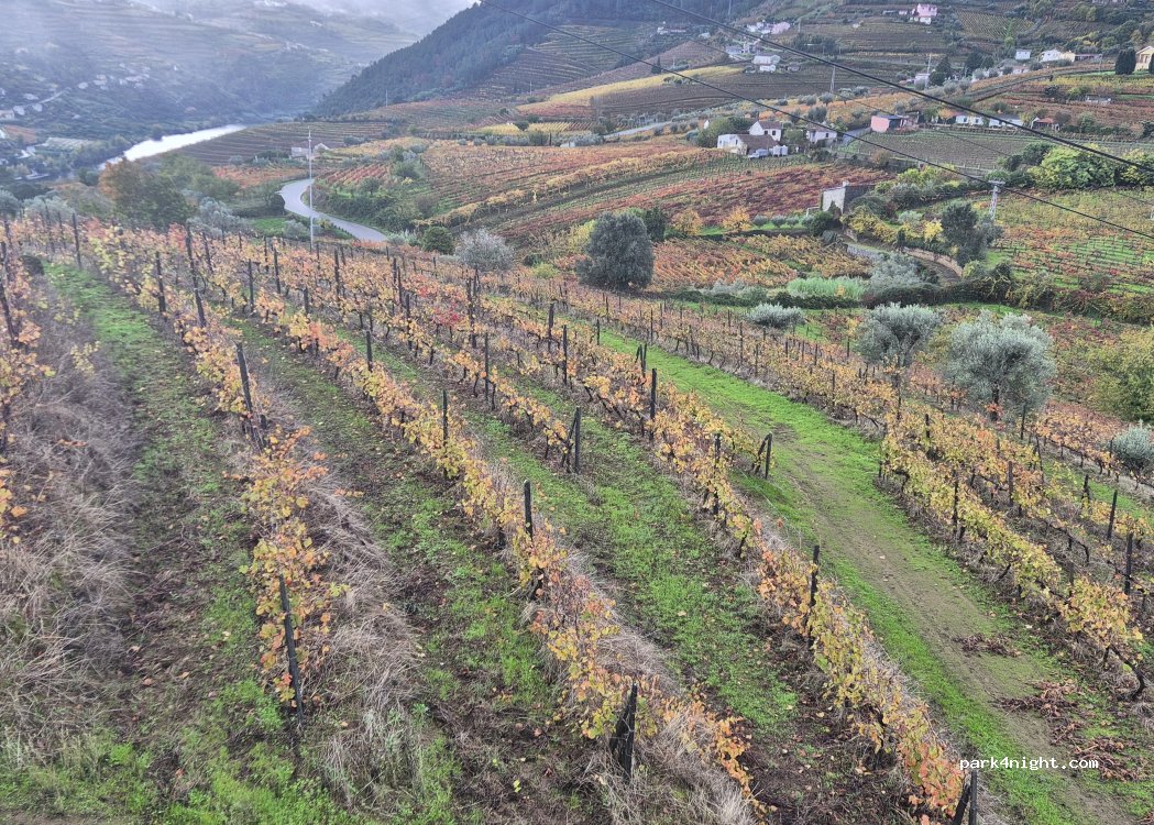 Parking étendu à côté du cimetière, plat et éclairé en bas (à environ 100 m de la route N101). Vue imprenable sur la vallée du Douro et les vignobles. La petite ville de Mesão Frio se trouve à 1 km au-dessus.