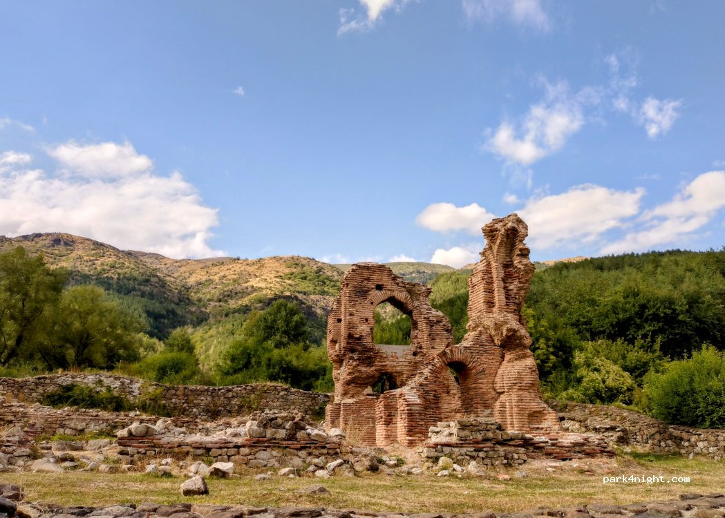 At a spring surrounded by nature. At a basilica ruin.