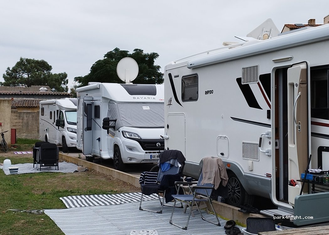 Belle aire. Emplacement délimité mais tout le monde dépasse et table et chaises sont sur l'emplacement d'à côté. Il n'y avait pas trop de monde donc cela passe bien. A côté du port des commerces des restaurants fête foraine et jeu Casino. petit bémol les arènes sont juste à côté 3 fois par semaine. sinon impeccable.