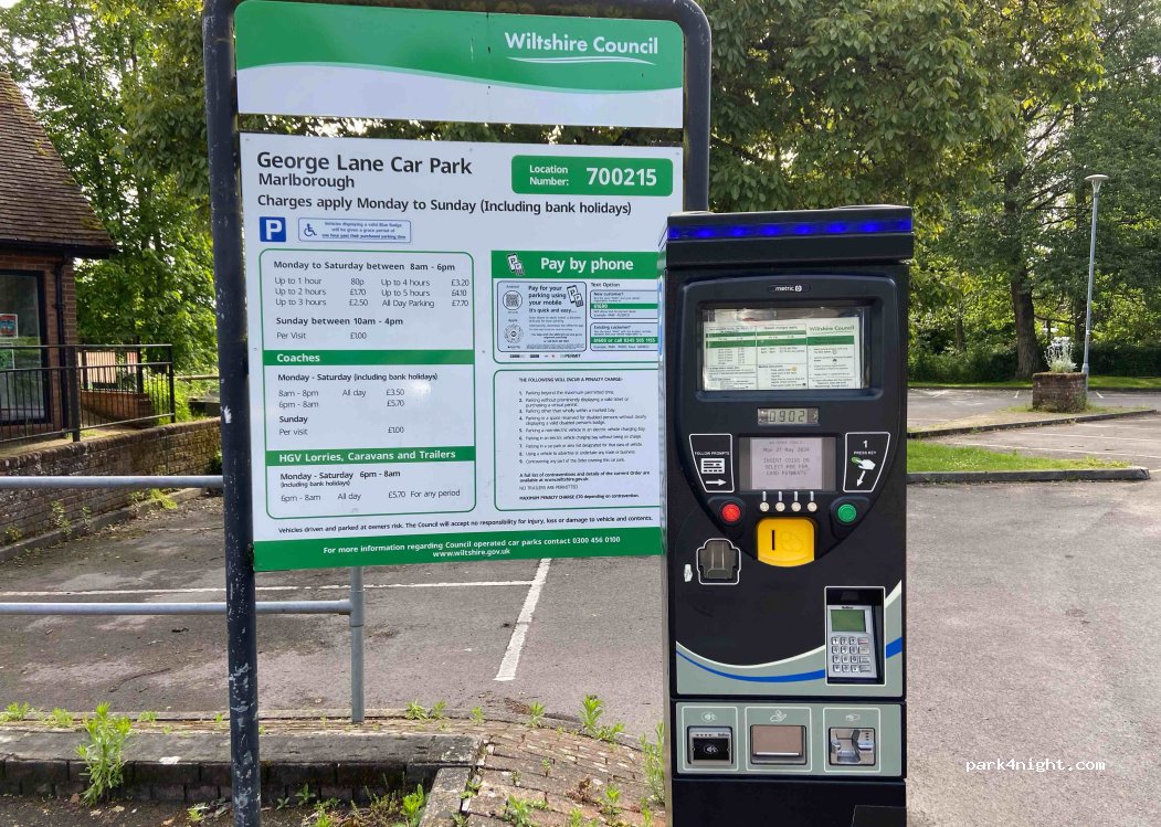 Excellent car park. Free from 6pm and as Sunday morning parking is free until 10am, we had a nice lie-in. very central as Marlborough High Street is a short 5 mins walk away (via Waitrose). Another bonus is the excellent kebab van on site opposite the police station. Lots of room by the kids playground. Nice and level spaces. We will definitely return.