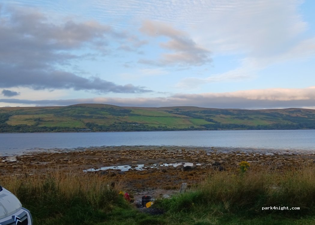 Grassy area in edge of loch and beach in gravel. The only spot available on the b8000 in addition to the one already indicated. There is absolutely nothing but the road, Kilbride Bay is a national reserve accessible on foot 30min and without parking .. and the rest is farms. 2 hours of roads without a place to land 3min to eat is long .. And really "secret", there is absolutely nobody. The road is limited in height width and weight, only for car and van. If you come across the seafood truck, they sell good Scottish fish and some fruits and vegetables. The area is quite fat and wet but access is easy. Go backwards and go straight, or vice versa, to avoid turning over the area that would hasten the grass and make the area quickly muddy and inaccessible ... A fire is present (it was still smoking) when I arrived ...) Road quite calm, beautiful view but little relief.