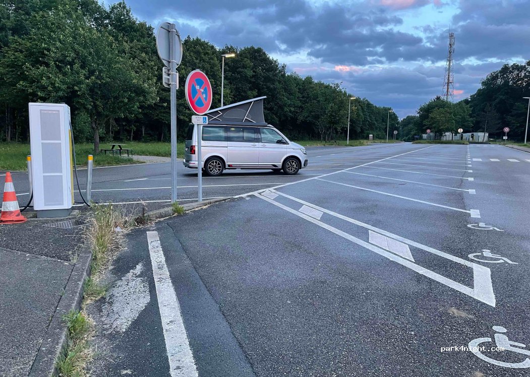 We stayed overnight pulled in about 4pm and parked near the big Ariel at side of wood ..nobody bothered us.. filled up with water ..showers and toilets to use if needed… we were self sufficient… shop well stocked and cafe..right next to A4… we were on way to Switzerland…little noisy with lorries but still slept well..