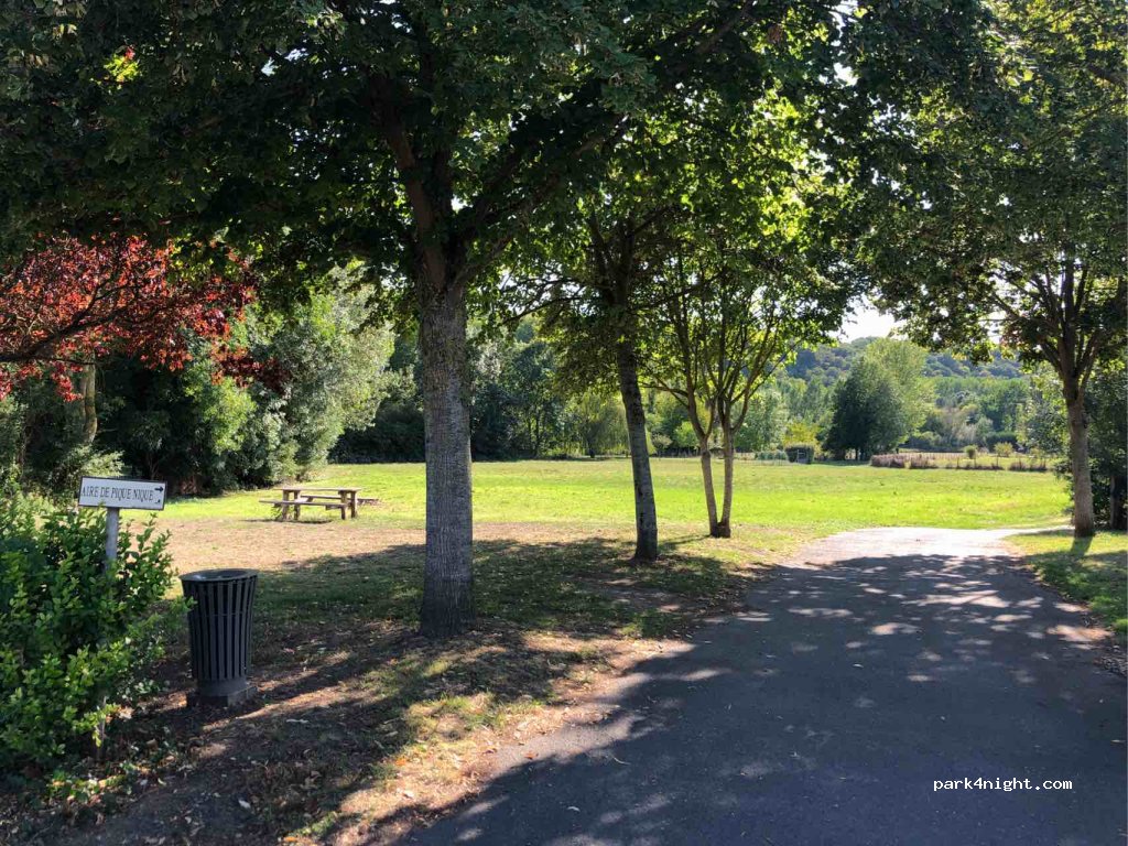 Aire de repos avec 6 tables de pique nique et très grand espace vert à l’écart de la route pour détendre idéalement vos animaux. Y avons fait une pause en pleine journée. Aucune interdiction pour y passer la nuit. Endroit calme sur la route principale à la sortie d’un des plus beau village de France.