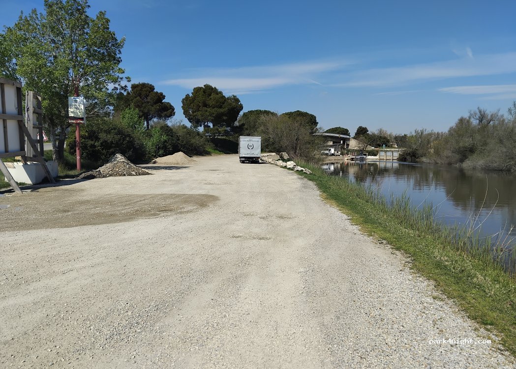 Grande aire sympa bord d'un petit canal. Mais pêcheurs tôt le matin. On peut également traverser le parking et passer sous un pont en tournant à gauche au bout du parking et se retrouver au bord du canal de Rhône à Sète. Plus tranquille.