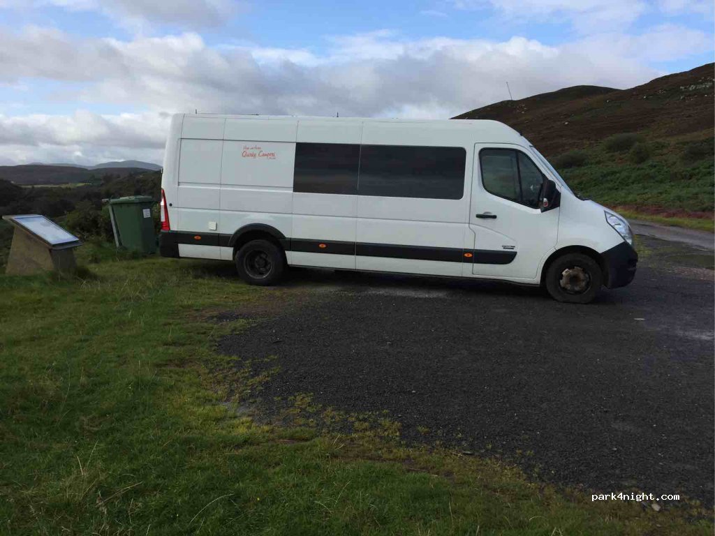 Une simple place de parking, au bord de la (petite) route, avec une poubelle et assez grande pour un à trois gros véhicules (camping-cars ou camionettes). Quelques points de vue, mais surtout, au tout début des 15 minutes de marche, par un sentier boueux longeant la rivière Borgie jusqu'à la magnifique plage de Torrisdale. Assez éloigné dans l'ensemble.