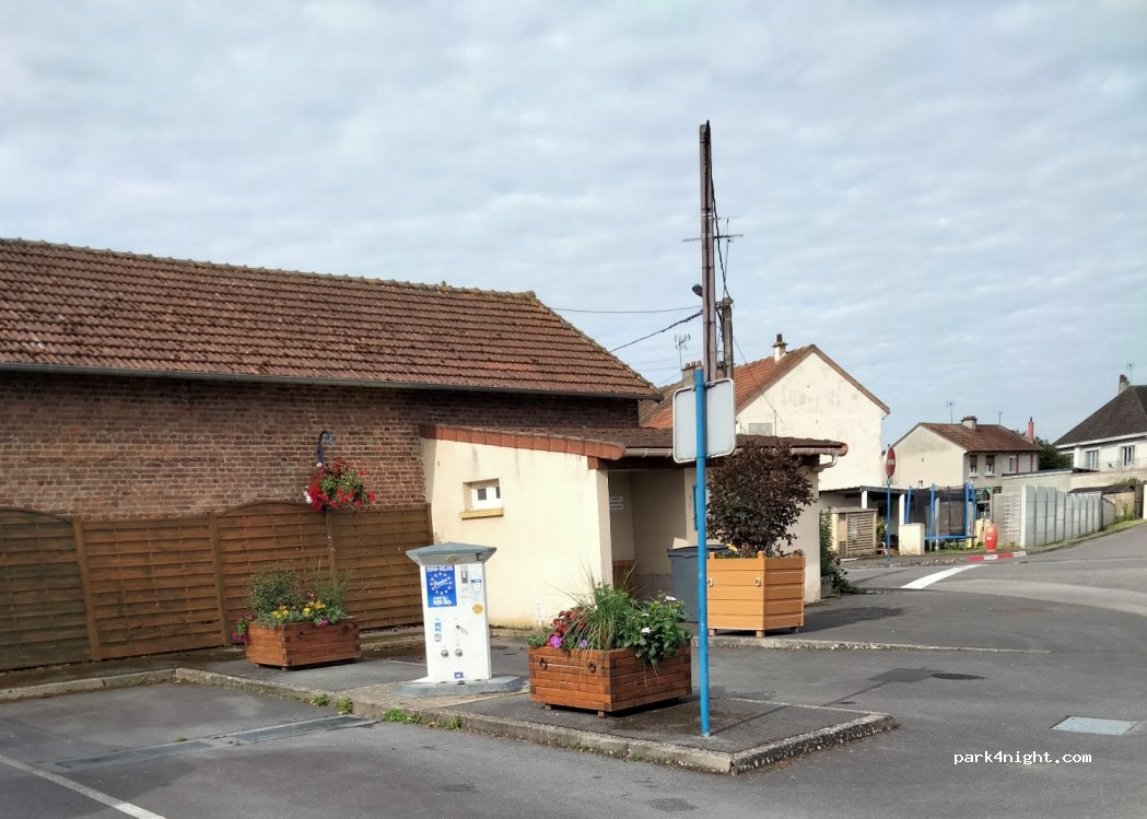 nuit très calme. pas de circulation dans la rue. gratuit. 3 places. vidanges euro relais. 2 € 1 h électricité. 2 € eau. proche boulangerie, mc do, lidl a pied. ideal pour 1 nuit.