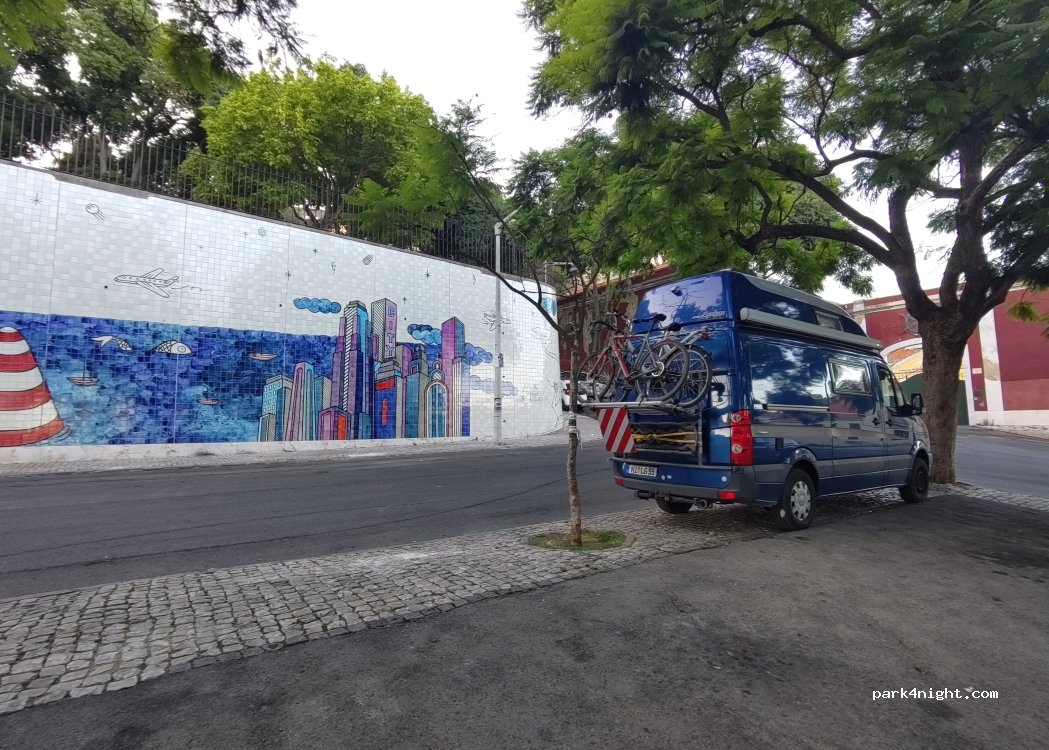 Very central and it’s quiet at Night. It’s one of the rare free and flat parking lots of Lisboa. In the morning you probably get woken up by a siren of the small military base (or maybe school) next to the parking area. At the daytime you can use the toilets of cafe clara.