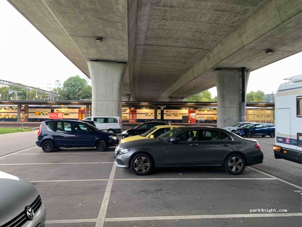 Very nice park around to walk the dogs. A bit noisy with the trains passing by but it was totally fine to spend one night. flat surface. good internet connection and it felt like a safe place to spend the night. you can also pay with the easy park app for the parking.