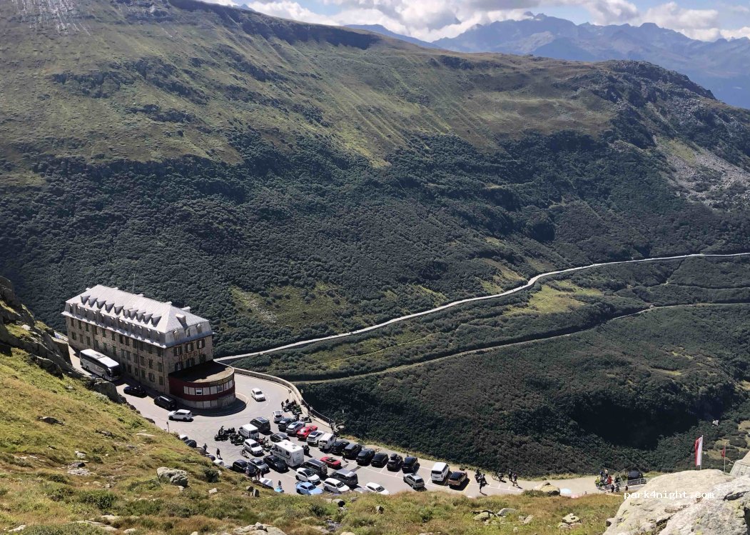 Parcheggio per l'accesso al ghiacciaio che dà la sorgente del Rodano. Spesso congestionato. Senza servizio.