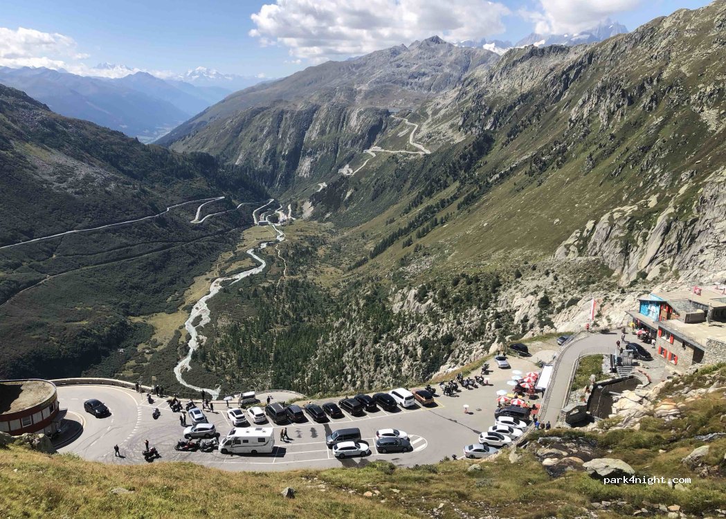Parking pour accès au glacier donnant la source du Rhône. Souvent encombré. Sans service.