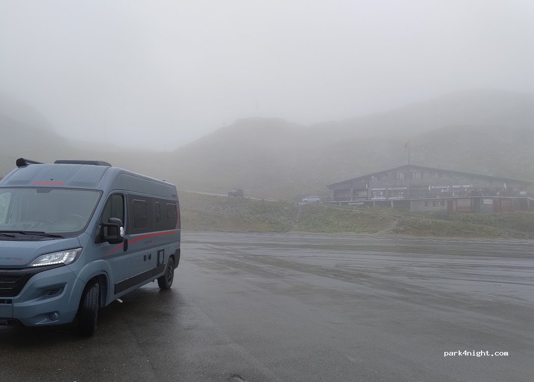 Auf Grund von plötzlichen Nebel mussten wir am Pass stehen bleiben. Auch das Übernachten war auf der großen Fläche kein Problem. Ohne Toilette, daher nur für Selbstversorger möglich. Tolle Aussicht und auch windgeschützt. Ein besonderer Platz. Die Schilder gelten für die Gemeinden nach dem Pass, in denen das Parken über Nacht für Wohnmobile an den meisten Stellen verboten ist.