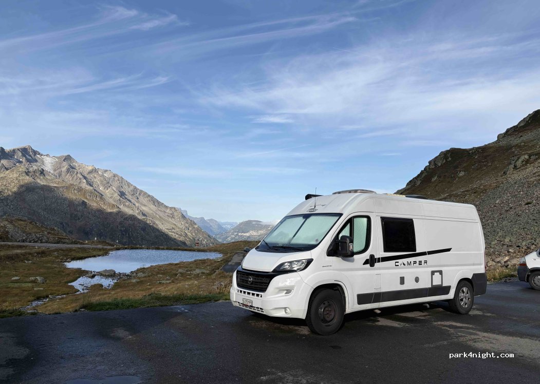 Just a large asphalt parking lot but at the very top of the pass with great views. Relatively flat. Free. Perfect 5G signal with Swisscom. Many other campers on the weekend. Pay attention to pass closures throughout the winter.
