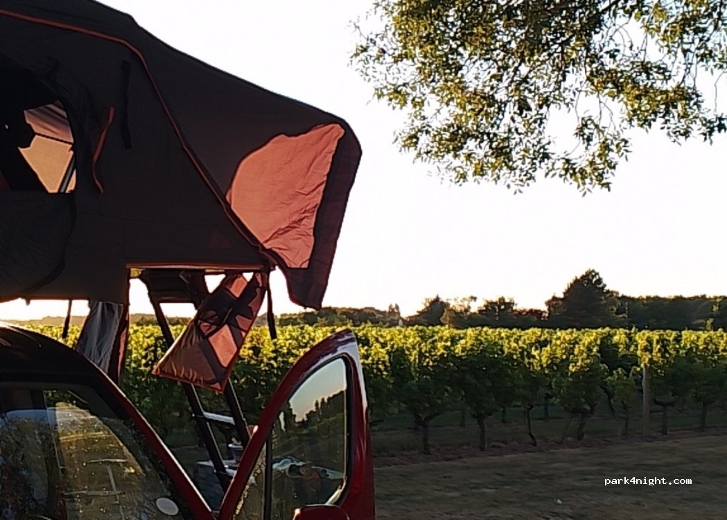 Nous avons appelé au préalable le domaine afin de demander si nous pouvions y passer la nuit en tente de toit. Le domaine est très beau, nous avons été très bien accueillis par une dame qui nous a fait une super dégustation ! Nous avons acheté quelques bouteilles en échange de son hospitalité. Nous avions accès aux WC et douche. Une nuit calme et paisible !