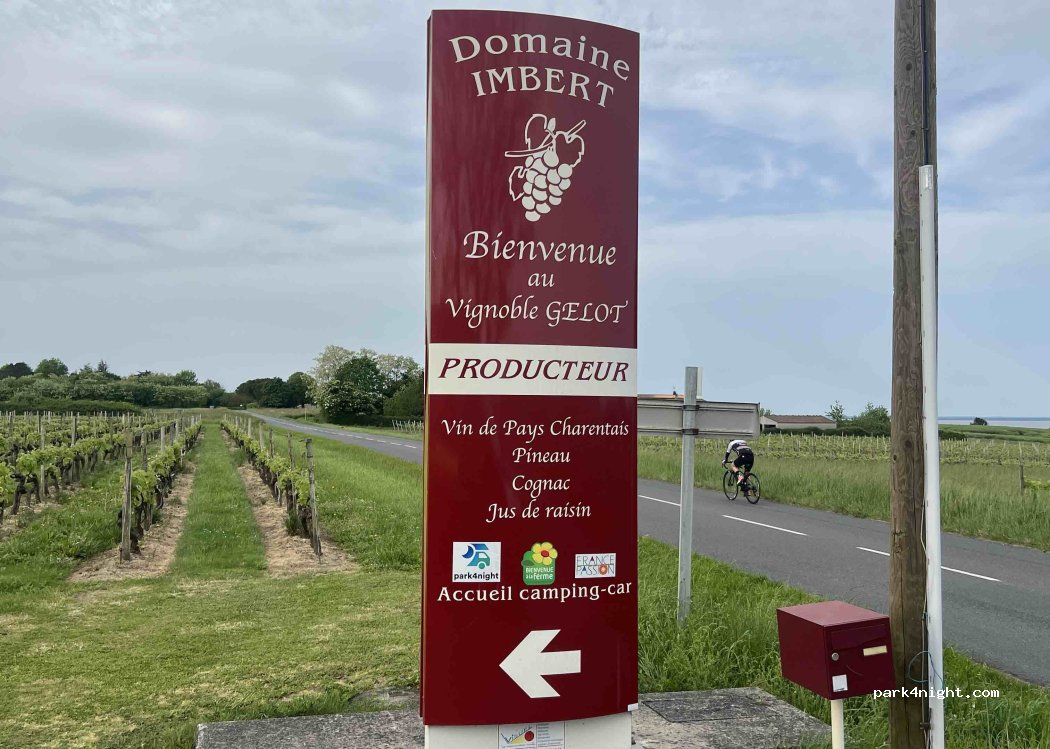 Excellent acceuil des propriétaires. Très belle aire à l entrée du domaine avec vue sur les vignes et l estuaire. Coucher du soleil en prime. Services gratuits (eau, électricité, bloc sanitaire ) en jouant le jeu de l achat des excellents Pineau. Dégustation aussi de Cognac et vins. Accès au village à pied 1 min de marche sur chemin en herbe et 10 min du coquet port de plaisance et des rivages.