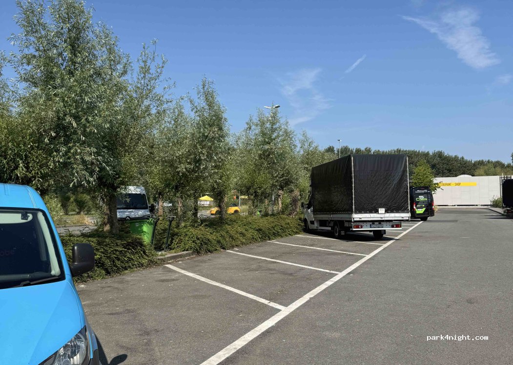 Stayed here as an overnight stop before heading to Bruges. Fairly quiet (it’s a service area, so of course there is some noise from vehicles coming and going.) Toilets are very clean, and the machine gives change if you don’t have .50c (no notes though). Only a 1 hour drive from Calais. Also a shop/petrol/coffee if you need it. I would stay here again. Large parking area.