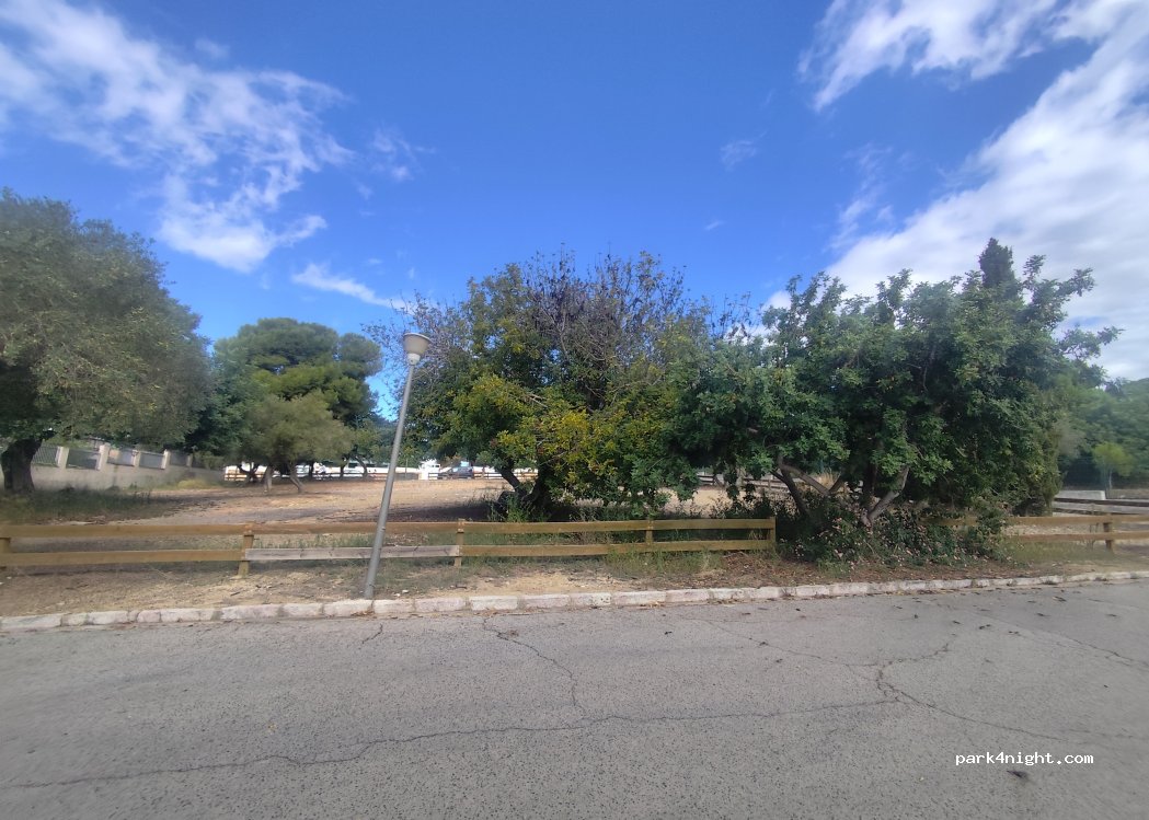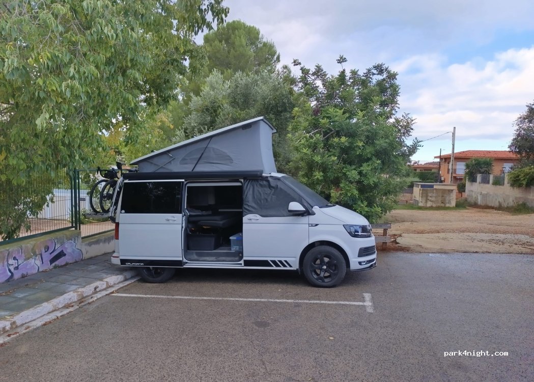 Se trata de un parking de tierra junto a unas ruinas romanas y a una calle de la playa dónde hay duchas y lavabo. Justo en la puerta de las tuinas hay contenedores. Tranquilo para pasar día y noche. La policía ha pasado un par de veces y no ha dicho nada.