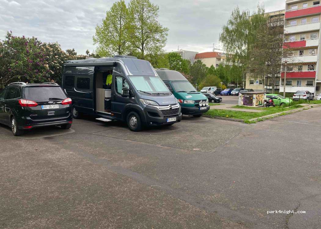 Bel endroit entouré d'un lotissement. Aussi faisable pour les plus grands mobiles. À la Conertplatz au coin de la rue, Wi-Fi gratuit dans le parc. Utilisez éventuellement des douches, des toilettes et de l’eau dans le stade de football. Il suffit de demander. Bar sportif avec toilettes. Les tramways sont très proches. (12 à la Conertplatz, 7 et 6 de la boulangerie Malterstraße à la Conertplatz 13 minutes avec la ligne 7 dans la ville.