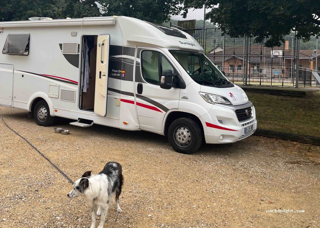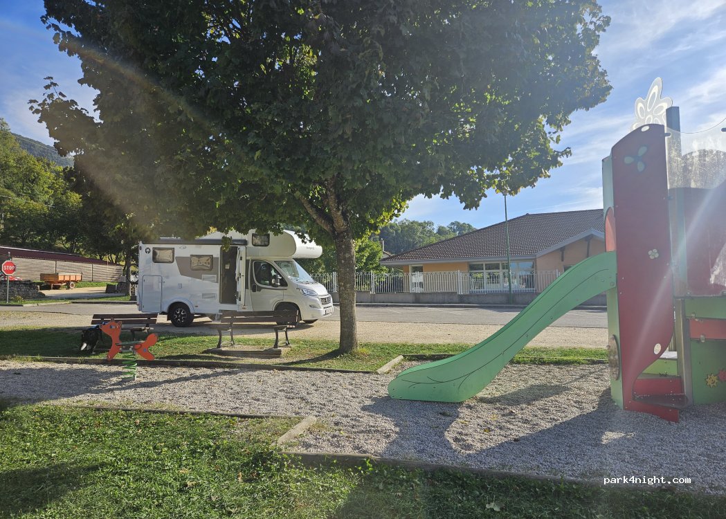 Perfecto para pasar la noche! Súper tranquilo y seguro, entre montañas, con pista de fútbol-basket, parque infantil y wc público al lado. Hemos pasado la noche y genial. Perfecto de camino a Grenoble o Ginebra!