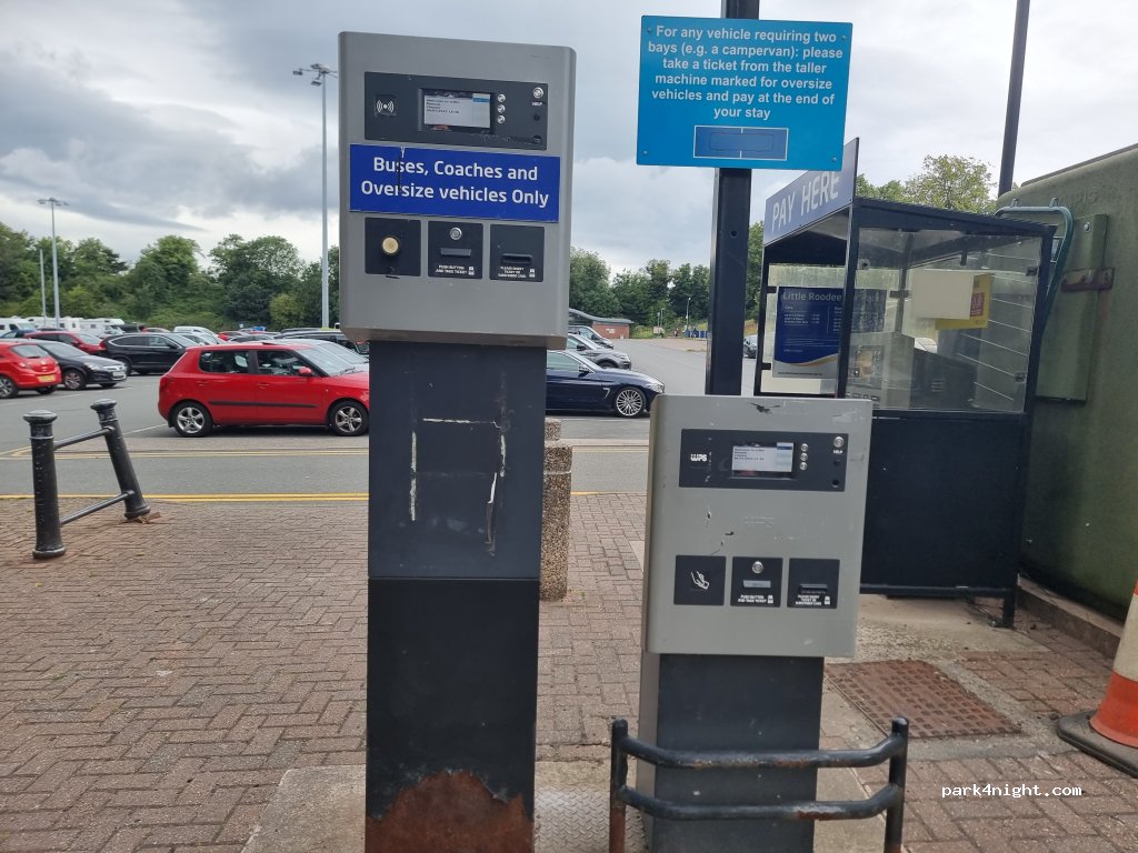 Quiet & close to town. Great little cafe in the car park. At the entry barrier. Car = Short machine, 1 bay. Van, Camper, Motorhome = Tall machine, 2 bays. Easy to miss the second Tall one, and the signage is not clear. Charges and timings are not the same for the two classes of vehicle.
