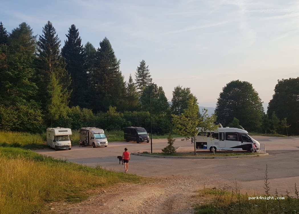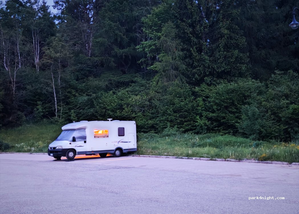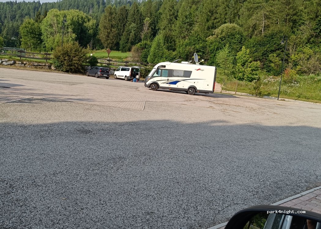 Ottimo parcheggio per sosta notte e giorno, nessun disturbo lontano dalla strada, ma subito sulle piste e dove partono i sentieri. Paese a 2 min a piedi, molto bello.