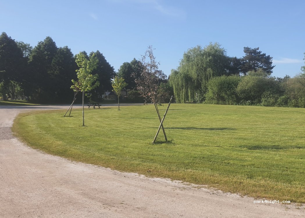 aire de stationnement au calme en sortie de village avec des tables de pique-nique et une borne pour vidanger les eaux usées et recharger en eau propre (gratuitement). De l'autre côté de la route il y a un petit parc sympa avec un étang.