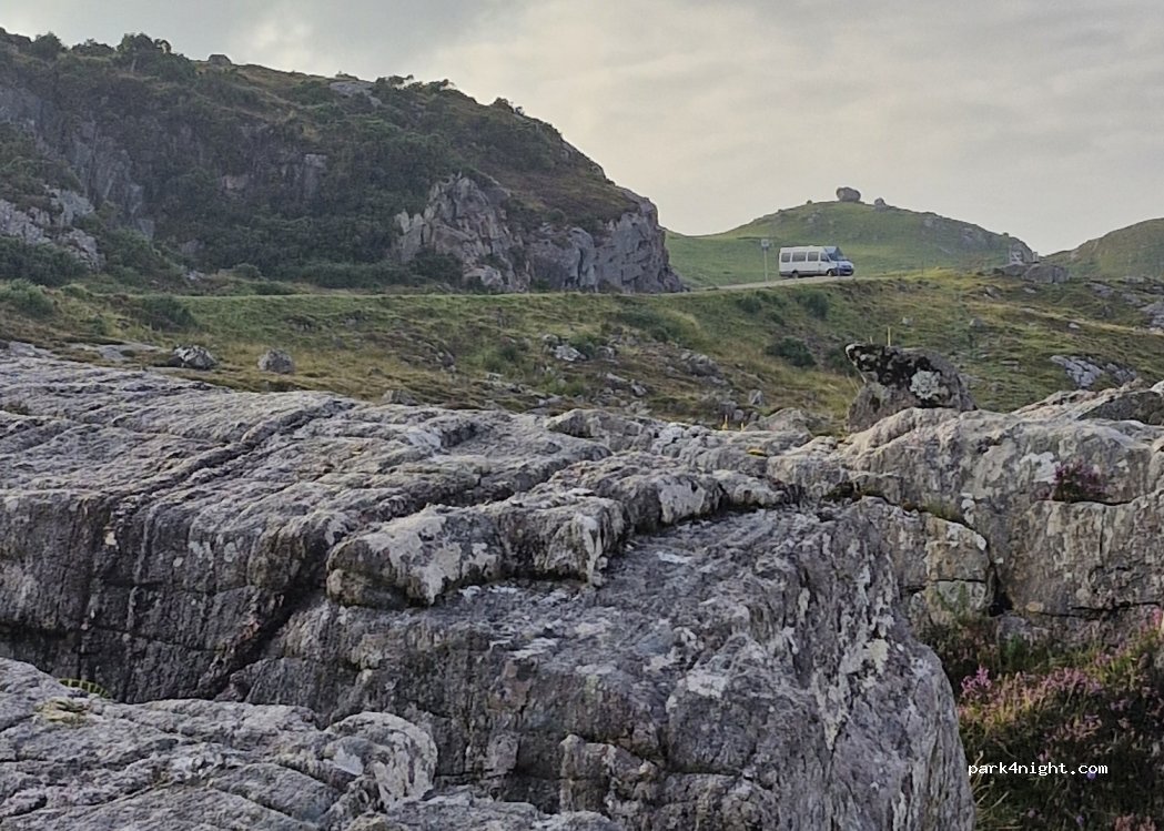 Stayed in a layby a little further down on the opposite side of the road. Very popular, spaces full at about 6/7ish. Right next to the beach. Bins on site, but no other facilities or mobile signal.