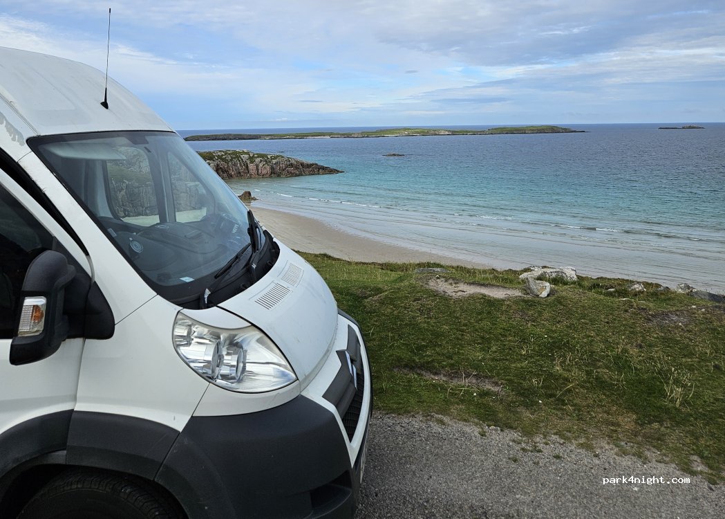 Wow! what a park up. Incredible views overlooking Ceannabeinne Beach. Space for about 4/5 camper vans /motorhomes but on a slight slope. Get there early enough to secure a spot as it fills up quickly. Highly recommend!
