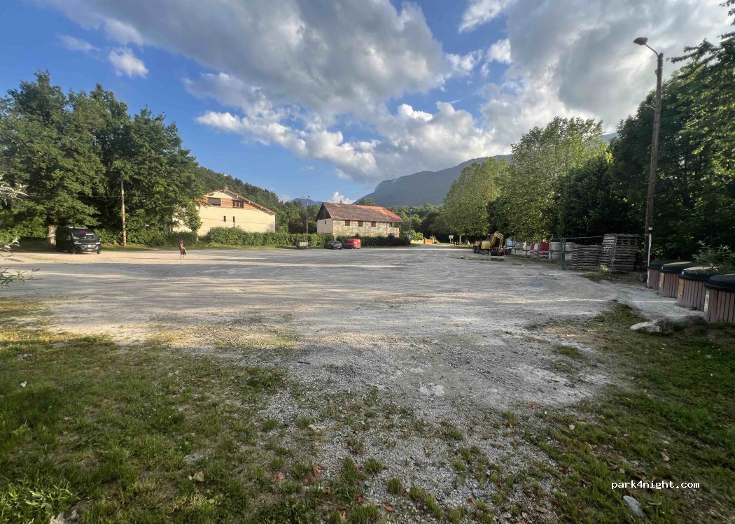 Très tranquille, grand parking en gravier, poubelles, aucun services, une belle vue sur les montagnes, terrain de boules, et petit inconvénient, au fond du bâtiment une association de chasse, et quand la chasse est ouverte, comme aujourd'hui défilé de voiture dès 6h30