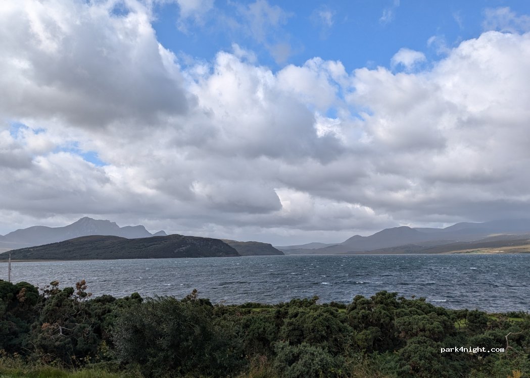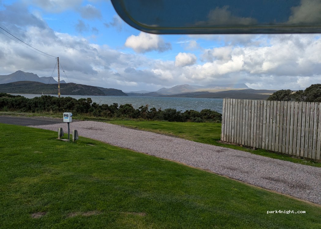 Tolle Lage mit herrlichem Blick auf Berge und Meer direkt an der NC500. Die Straße ist wenig beffahren (Anfang Juli) und stört nicht. WiFi nur im Cafe gut. Kann dort aber auch ohne Verzehr genutzt werden. Sanitäre Anlagen sauber und gut. Gut für eine Zwischenübernachtung.