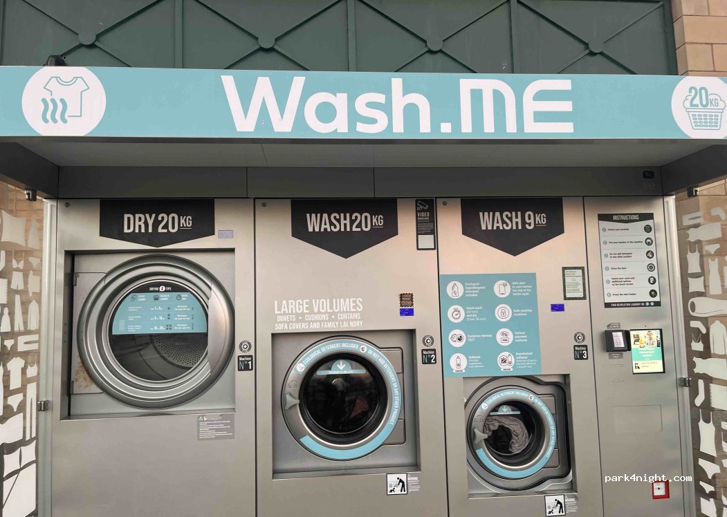 Not a place to overnight, but it's free parking in the Morrison's carpark, with outdoor laundry facilities, 8kg for £4 and 18kg washer for £8 and dryer is £2 per 15 minutes.