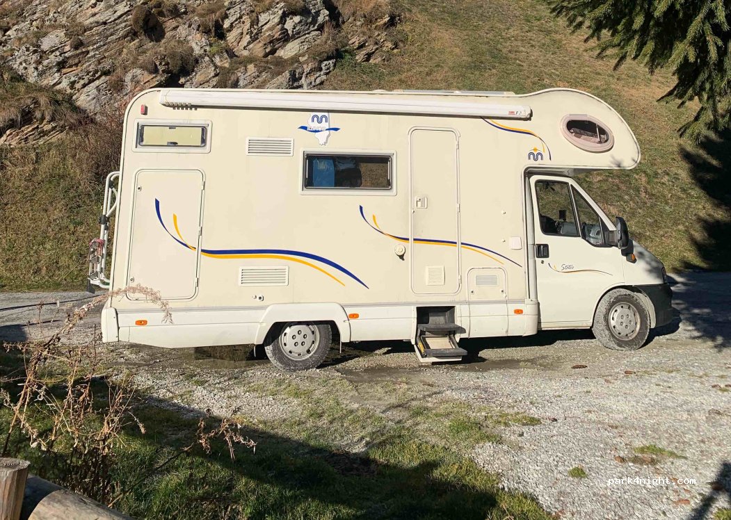 Questo è il parcheggio del santuario di San Magno riservato ai camper. Quindi nessun problema sia di giorno che di notte. L'altitudine è oltre 1700 mt slm, decisamente fresco di notte anche in estate. Nel periodo estivo sempre molto affollato nei fine settimana. È solo un parcheggio senza alcun servizio