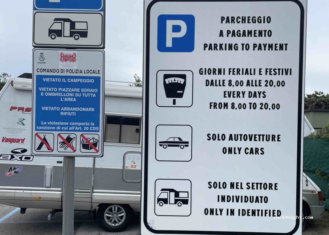 Parcheggio 12 euro dalle 8 alle 20. posizionato all’ingresso del camping Vittoria con accesso direttamente sulla spiaggia. Noi abbiamo passato una notte a fine luglio ed era tranquillissimo. Ad esclusione di sabato e domenica, il campeggio Vittoria fa il servizio di camper service 12 euro x carico scarico. Il mattino dalle 10 alle 11 e poi il pomeriggio dalle 17 alle 18