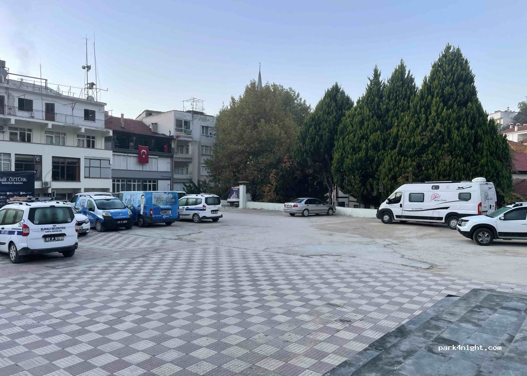 Elmalı Belediye Parkı parking opposite the mosque. Free. The center. In the immediate vicinity of good restaurants and a hill overlooking the mountains, the city and the valleys all around. Very friendly, generous and helpful people. Toilets at the mosque