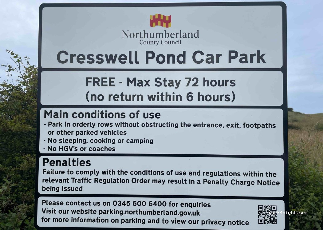Creswell Pond Car Park (Free) max stay 72 hours (No return within 6 hours). Theoretically can stay here days on end provided away for half a day once in every 3 days! Sign says however, no sleeping, cooking or camping, whatever that means, & park in orderly rows not to obstruct anything. Use your discretion. Fantastic beach 2 min walk. 4G signal, level, responsible grey water discharge possible.