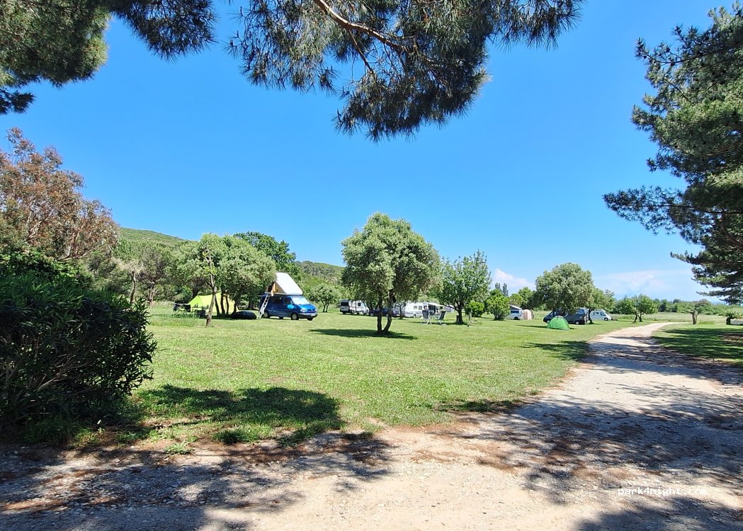 Welch wunderschöner CP, eingebettet im Tal, 7 Min zur schönen Bucht, saubere, moderne Infrastruktur! Den Camper stellst du irgendwo auf der Wiese ab. Stromanschluss hat’s überall. Mit Glück auch noch Schatten unter einem Olivenbaum. Auch der Empfang war sehr freundlich. So macht Camping richtig Spass!