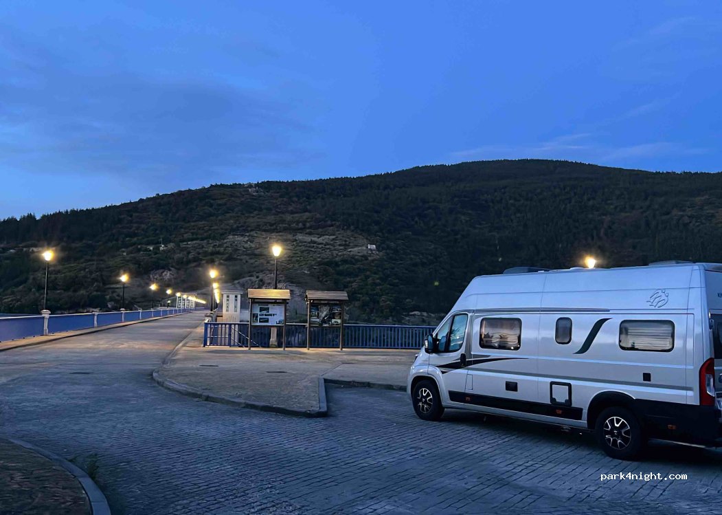 C’est une impasse avec une belle vue sur le barrage. Nous avons dormi à 3 vans, silencieux au début mais des gens sont venus en voiture dans la nuit pour faire la fête. Manque de possibilité de s’isoler ce qui fait que les alentours sont bourrés de papiers toilettes. Il n’y a pas de poubelles. Les lampadaires restent allumés toute la nuit. Joli lieu, mais dommage