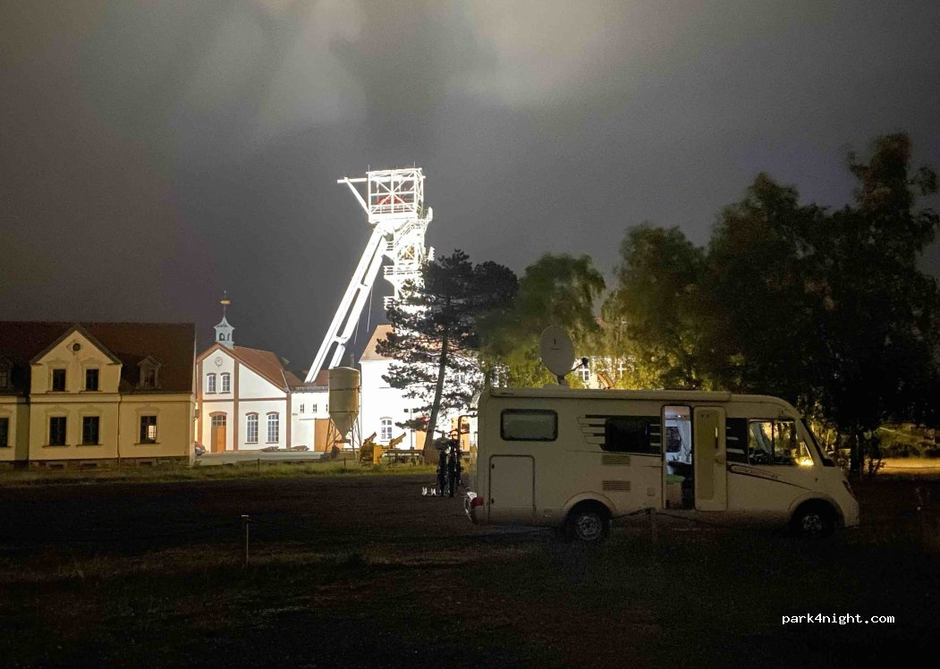 Visitor parking lot of the "Reiche Zeche" mine with a beautiful view of the landscape, flat floor space on gravel and eduroam cover ;-) Below there are another 4 spaces outside the site. The mine is open Wednesday through Sunday