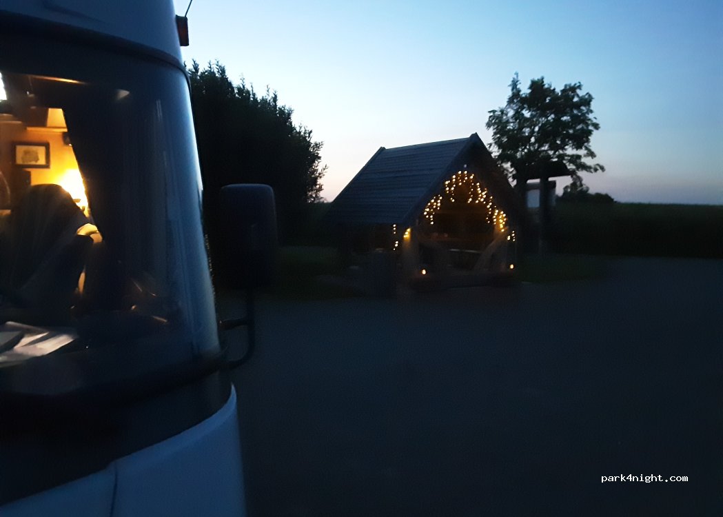 Wir haben hier eine schöne und ruhige Nacht verbracht, nachdem wir einen schönen Sonnenuntergang erleben konnten. Nachts ist die neue Wanderhütte sogar toll beleuchtet. Wir danken der Gemeinde und allen Sponsoren für diesen tollen Platz