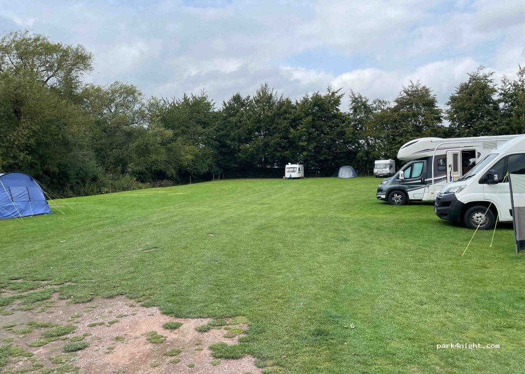 Grass level pitches. Basic toliet and free showers. Level. Next to river, road a bit noisey. Bistro Pub short walk away