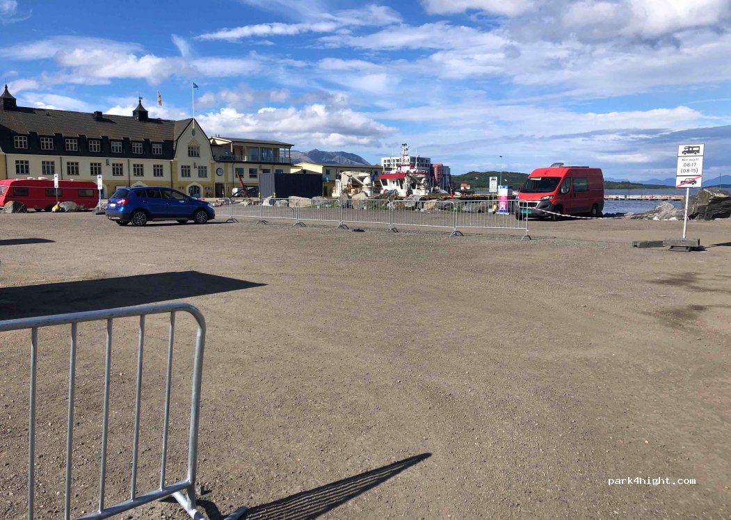 OK parking spot in the middle of Harstad. A bit expensive tough as you pay pr hour from 8AM to 5PM on weekdays and 8AM to 15PM on saturdays. Next to a citycenter where you can find toiletfacilities. There is a some noise as the parking area is next to cruiseships and a busparking area.