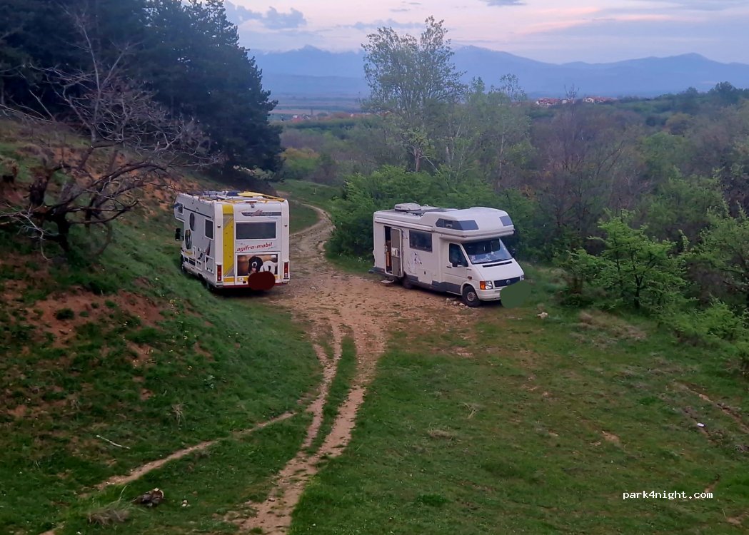Beautiful spot with a view over the city. We stayed the night not at the indicated spot, but just before reaching it drove up the steep fill next to the beehives. It’s public ground; a friendly local told us next day.