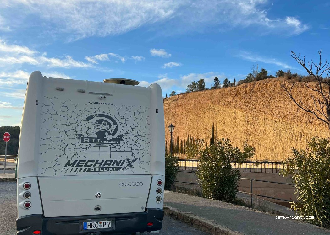 Stayed here one night as the other parking area to which we have stayed previously was full. This parking area was very noisy from passing car's unlike the other side! Then at just before 7am someone decided it would be necessary to throw a glass bottle at us just missing the van! couldn't get back to sleep then as a broken down coach arrived! If the other parking is full try elsewhere!
